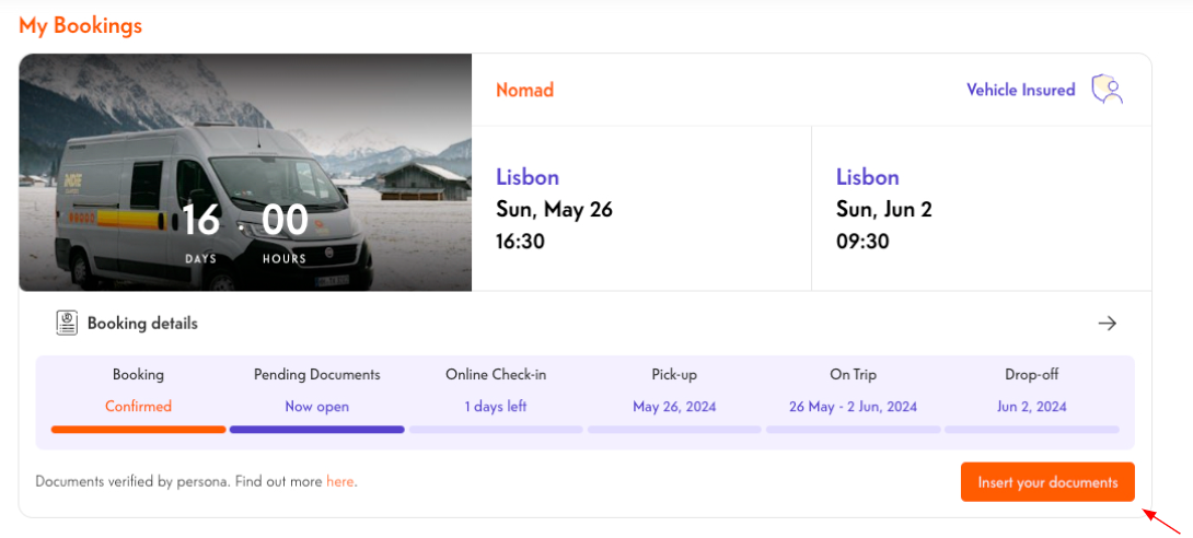 Haz clic en el botón naranja "Insertar Documentos". Se te pedirá que entres en Persona para iniciar la validación de los documentos. Para solucionar problemas de Persona, visita ¿Qué es la verificación de Persona? Solución de problemas y cómo funciona