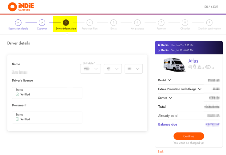 4 - Plan de protección: En este paso tendrás la opción de seleccionar uno de los planes de protección disponibles para tu reserva. Ten en cuenta las limitaciones de edad. Una vez completado, presiona "Continuar".