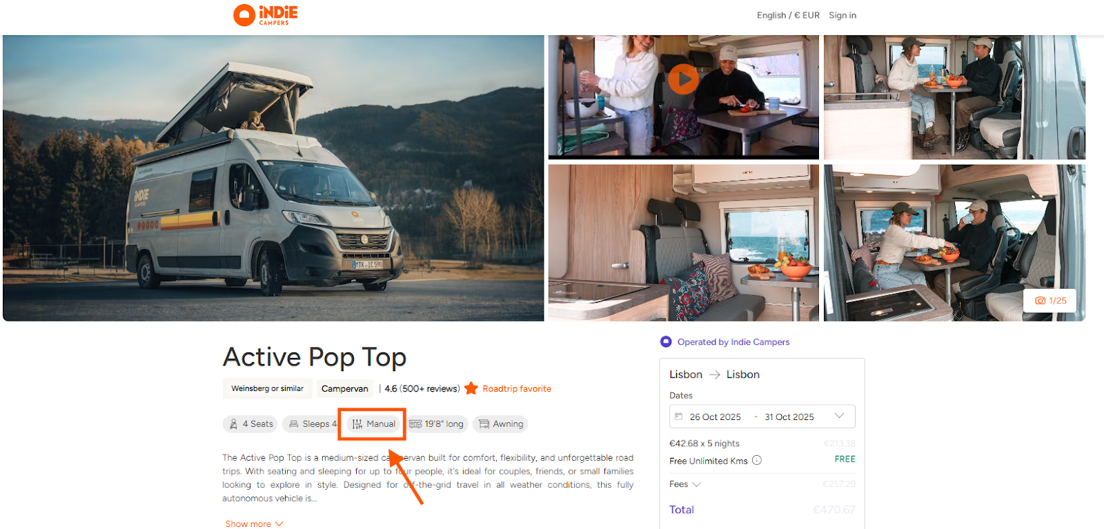 Al buscar el modelo de camper adecuado (flota de Indie Campers o Marketplace) para tu viaje, puedes encontrar información sobre el tipo de transmisión, basada en los iconos a continuación: