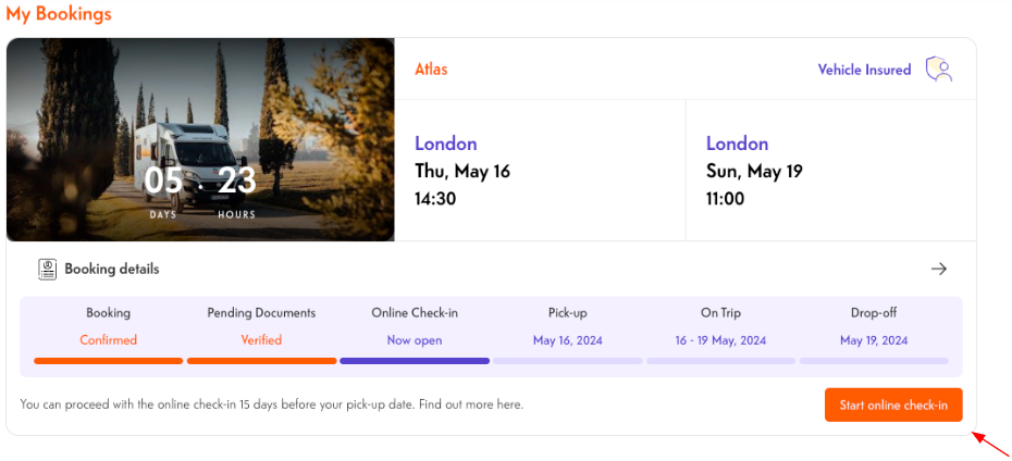 9 - Check-in confirmé : Vous êtes arrivé(e) à la fin de votre check-in et vous l'avez terminé avec succès. Vous avez maintenant accès à des vidéos tutorielles, des informations pour la prise en charge et le retour (adresse).