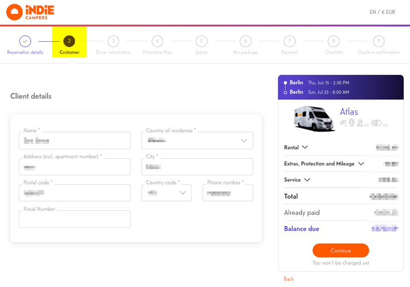 2 - Détails du client : À cette étape, vous pourrez confirmer/changer vos informations. Une fois terminé, veuillez appuyer sur "Continuer".