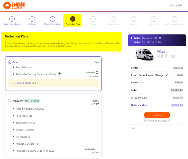 4 - Plan de protection : À cette étape, vous avez le choix de sélectionner l'un des plans de protection disponibles pour votre réservation. Veuillez prendre en compte les limitations d'âge. Une fois terminé, veuillez appuyer sur "Continuer".
