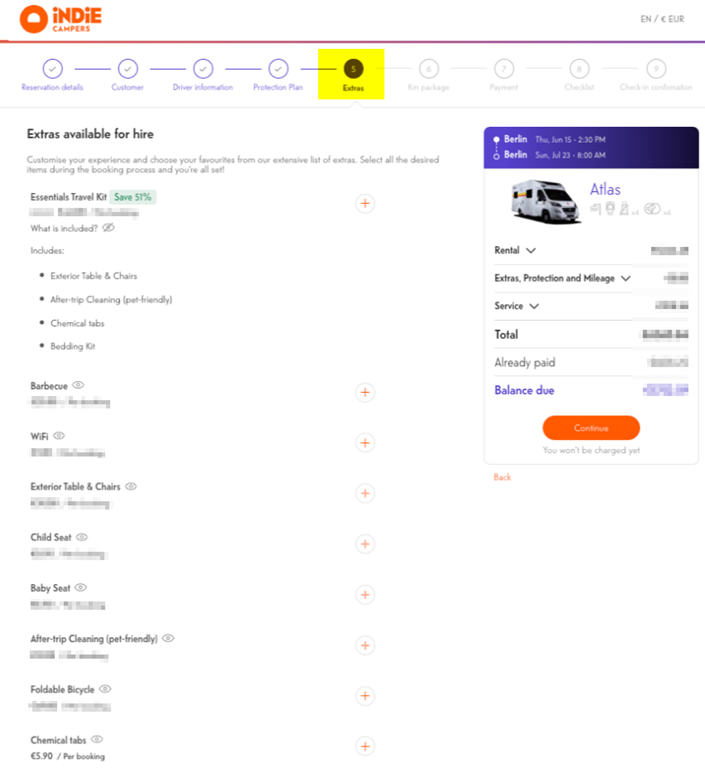 5 - Extras : À cette étape, vous pourrez sélectionner des extras (du kit de voyage essentiel à la bouteille de gaz, au Wi-Fi, aux vélos pliables, etc.). Une fois terminé, veuillez appuyer sur "Continuer".
