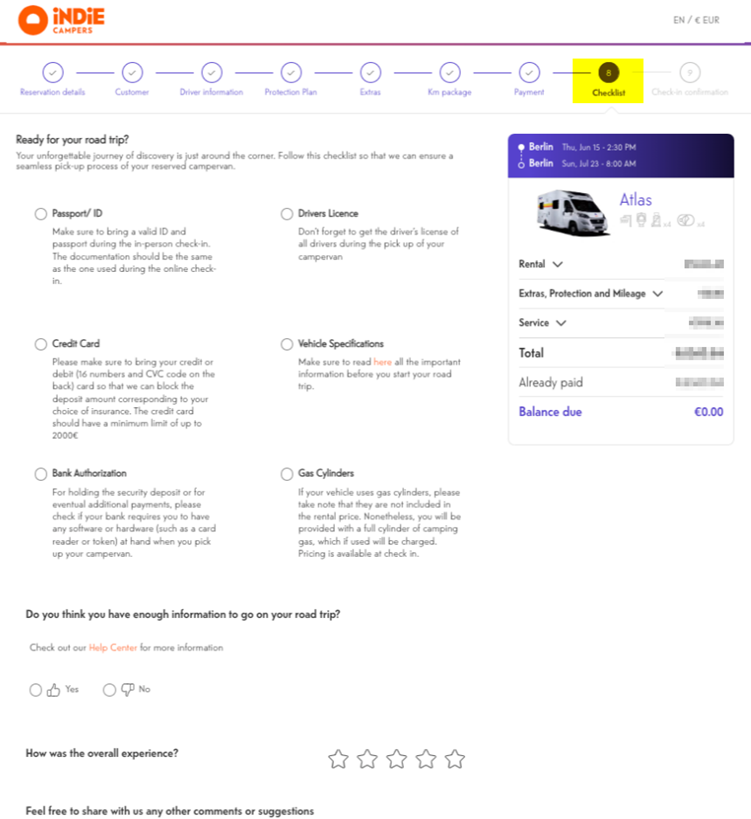 8 - Liste de vérification : À cette étape, vous disposez d'une liste de vérification pour confirmer que vous avez tout ce qu'il faut pour récupérer le camping-car à la date de prise en charge prévue (passeport/CNI, permis de conduire, carte de crédit/débit, spécifications du véhicule, autorisation bancaire et bouteilles de gaz, le cas échéant).