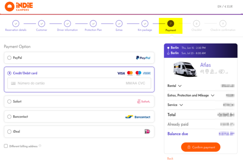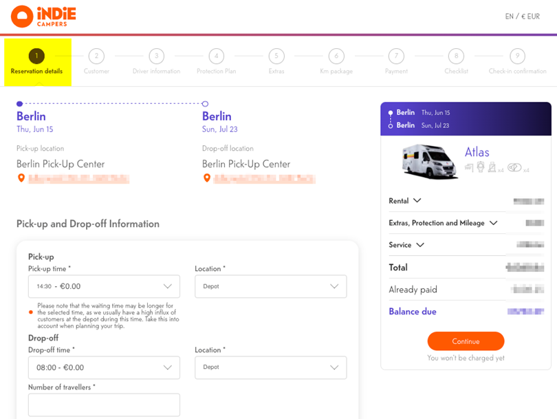 1 - Détails de la réservation : À cette étape, vous pourrez confirmer/changer les horaires de prise en charge et de retour. Une fois terminé, veuillez appuyer sur "Continuer".