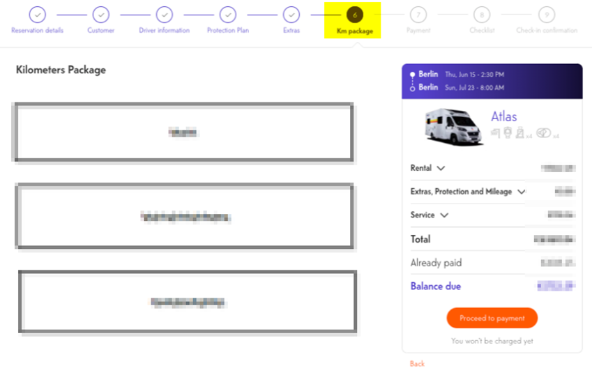 6 - Forfait kilométrique/miles : À cette étape, vous pourrez sélectionner les différents forfaits kilométriques/miles disponibles pour votre réservation. Une fois terminé, veuillez appuyer sur "Passer au paiement".